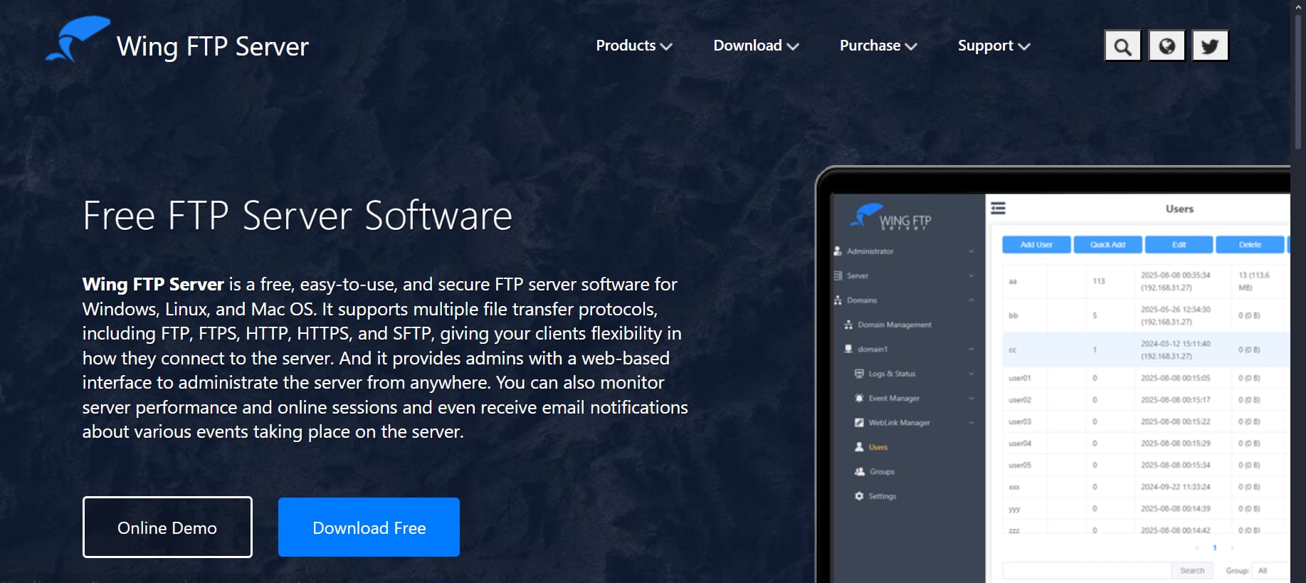 Wing FTP Server là một phần mềm máy chủ chạy trên nhiều nền tảng hệ điều hành khác nhau: Linux, Window, MacOS được phát triển để truyền file với nhiều protocols như: FTP, SSH, SFTP, HTTP, HTTPS,… Phần mềm này được sử dụng rộng rãi trong các doanh nghiệp, trong mạng nội bộ lẫn bên ngoài Internet.