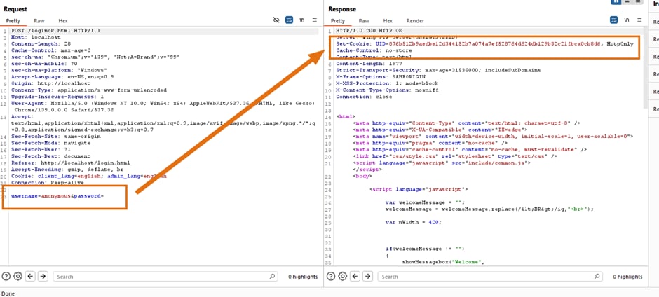 Quan sát hành vi thấy rằng khi người dùng đăng nhập sẽ tạo 1 yêu cầu POST với các tham số username=&password= tại endpoint /loginok.html. Người dùng đăng nhập thành công thì server sẽ sinh ra cookie với UID là một chuỗi ngẫu nhiên và tạo 1 file với filename là