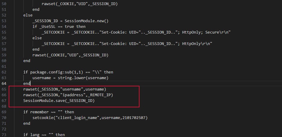 Nếu tài khoản hợp lệ nó tiếp tục thực hiện và đi xuống dòng 64 để set vào table _SESSION với key là username và value là input được người dùng nhập. Tại đây có thể thấy input người dùng đã được truyền trực tiếp vào _SESSION mà không có biện pháp filter hay validate nào cả. Tiếp theo là đến dòng 76 và gọi SessionModule.save() với đối số là _SESSION_ID