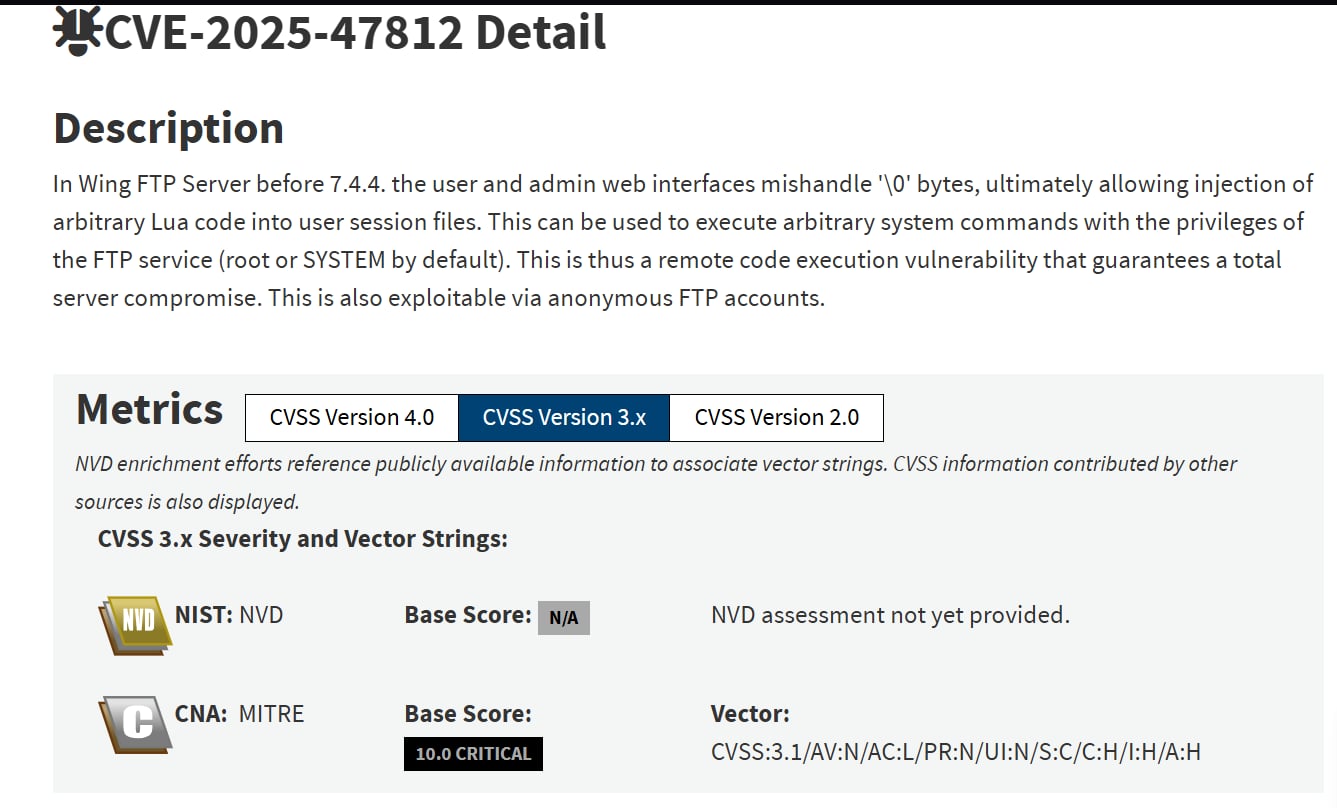 - CVE xảy ra trên máy chủ Wing FTP Server trước bản 7.4.4: Từ bản 7.4.3 trở xuống đã có thể bị tấn công